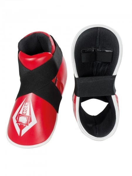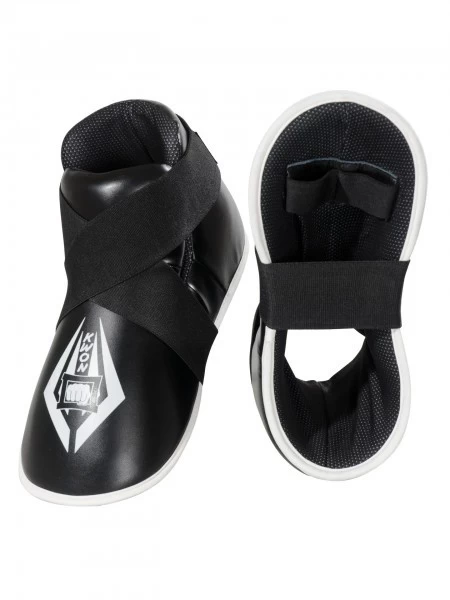 Das elastische Klettband dient zur individuellen Anpassung des Schützers am Fuß, ein zusätzlichem Elastikband an der Fußsohle sorgt für verbesserten Halt. Das Außenmaterial besteht aus hervorragend verarbeitetem, lederähnlichem Vinyl.