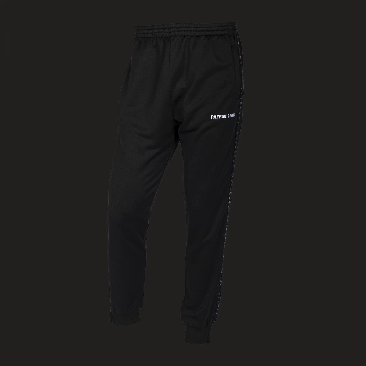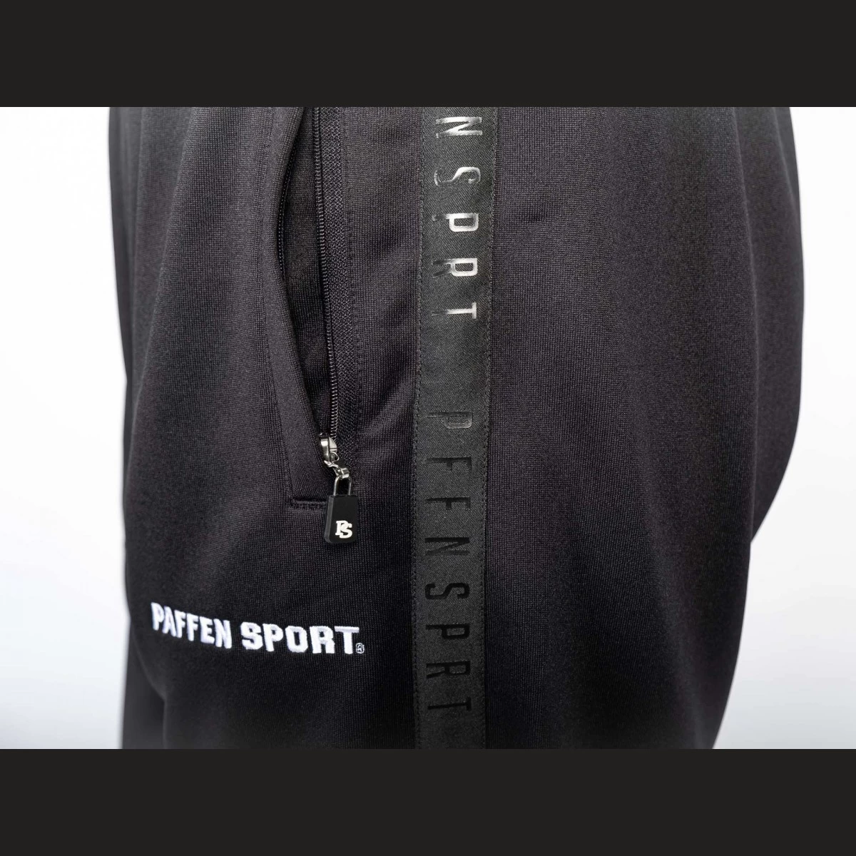 Athletic Fit Trainings- und Freizeitanzug in schwarz mit Flachnähten, dünnen matt-schwarzen Seitenstreifen mit trendigem Schriftzug „Pffn Sprt“ sowie klassischem Logo-Stick auf der linken Brust und dem linken Bein.