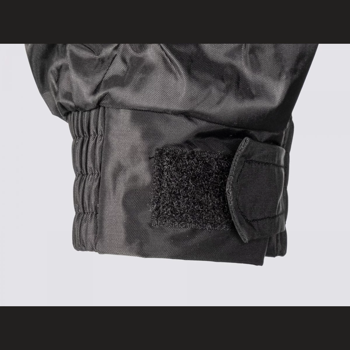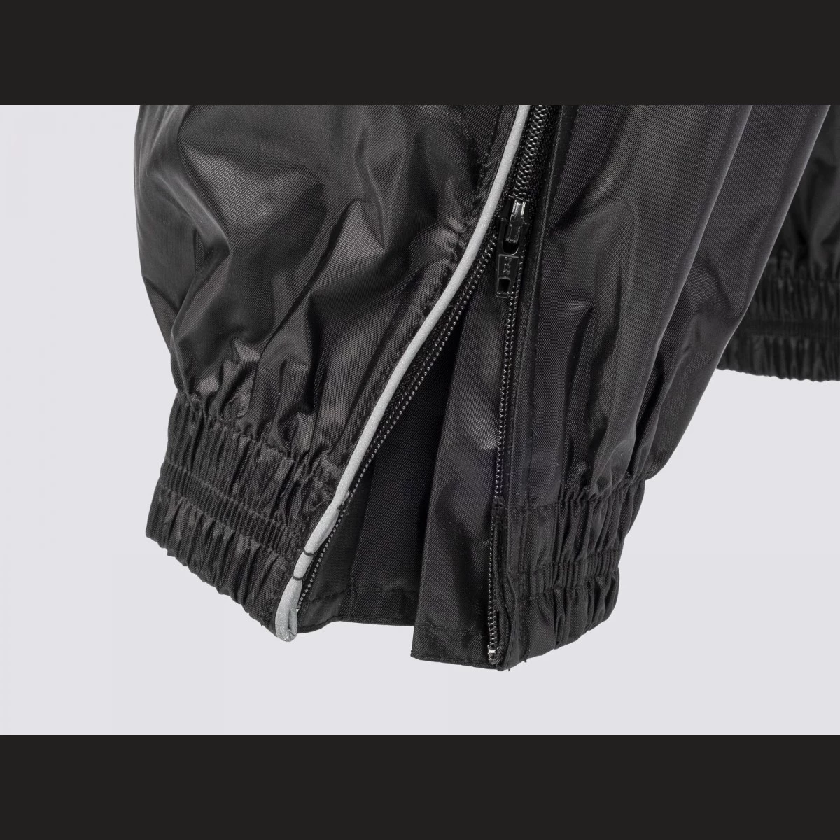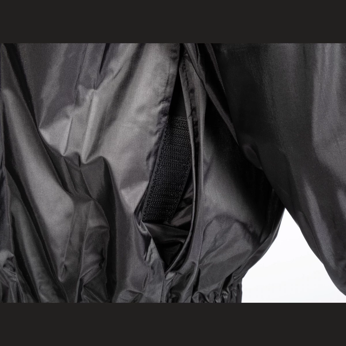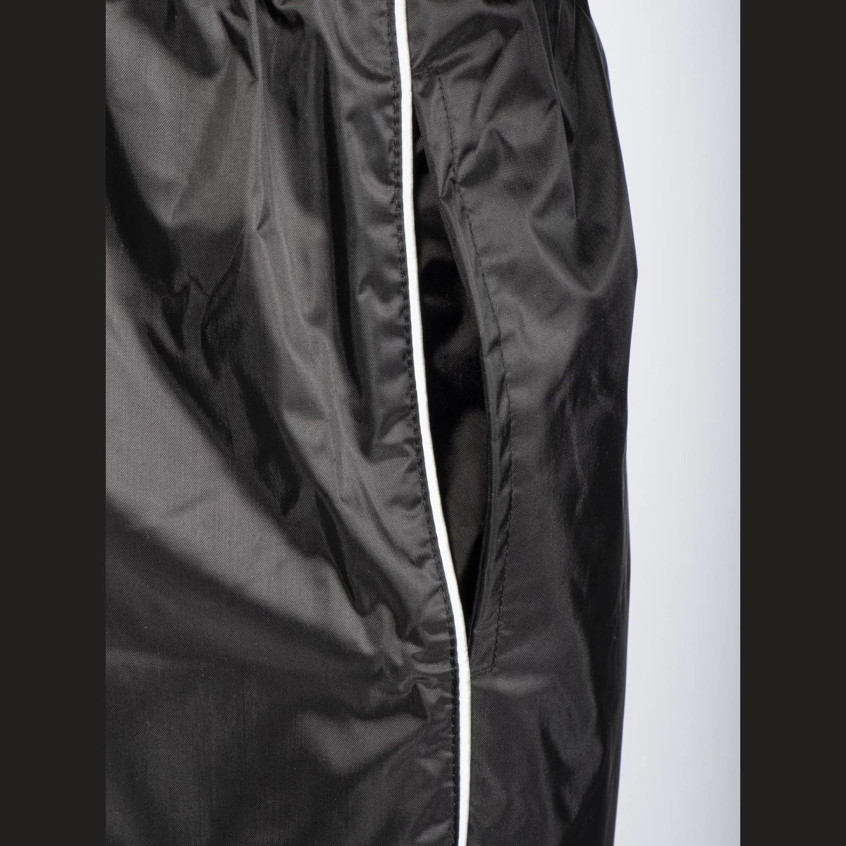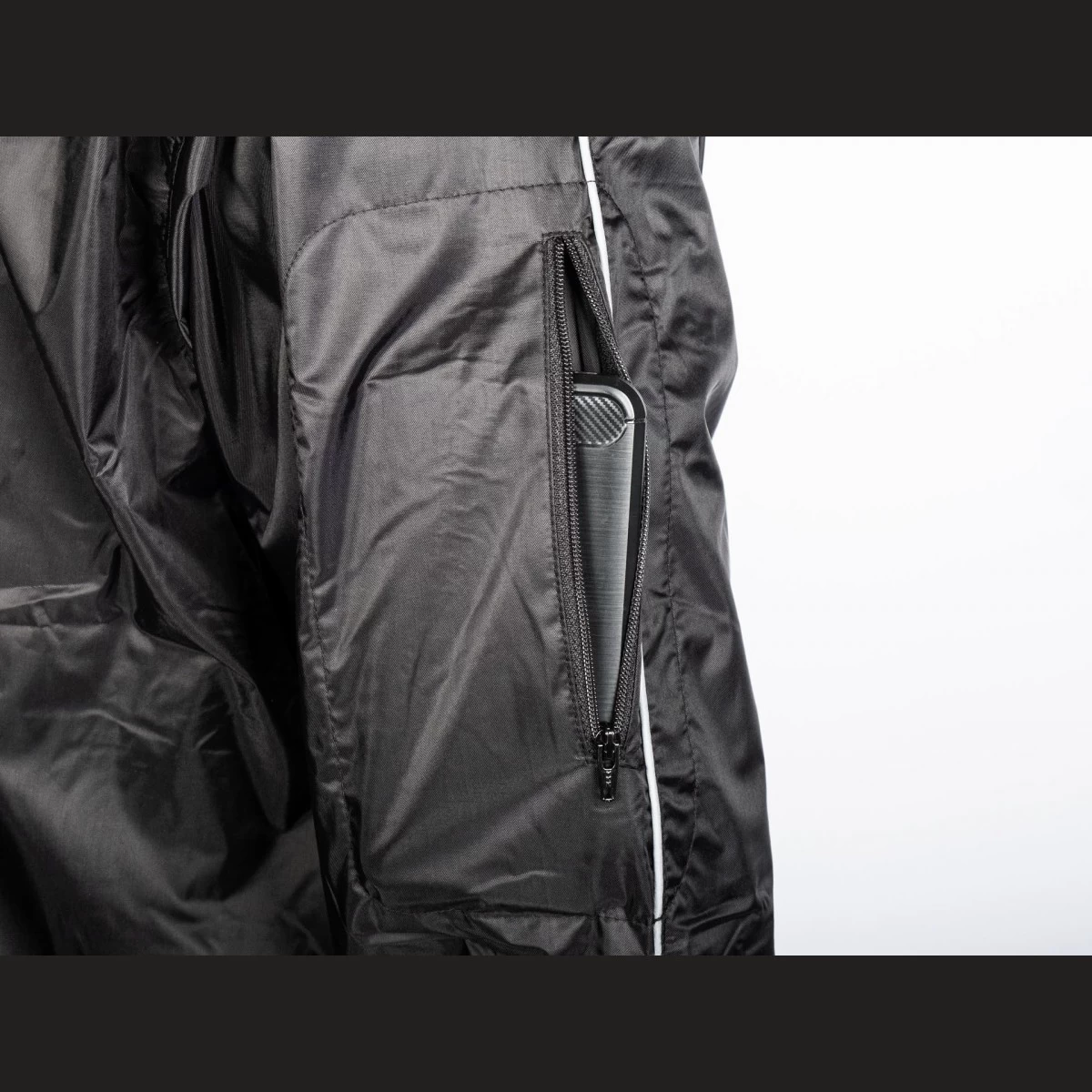 Zweiteiliger Anzug mit Kordelzug-Kapuze und reflektierenden Seitenstereifen. Passgenauer Sitz dank elastischem Jacken- und Hosenbund sowie elastischen Bündchen an Ärmeln und Knöcheln. Leichtes An- und Ausziehen der Jacke durch luftundurchlässigen Reißverschluss, Klettverschlüsse an den Ärmeln zur besseren Anpassung. Hose mit zusätzlichem Kordelzug am Bund und Reißverschlüssen an den Knöcheln. Zwei seitliche Eingrifftaschen mit Klettverschlüssen jeweils an Jacke und Hose. Praktisches Extra: die verschließbare Smartphonetasche am linken Ärmel.