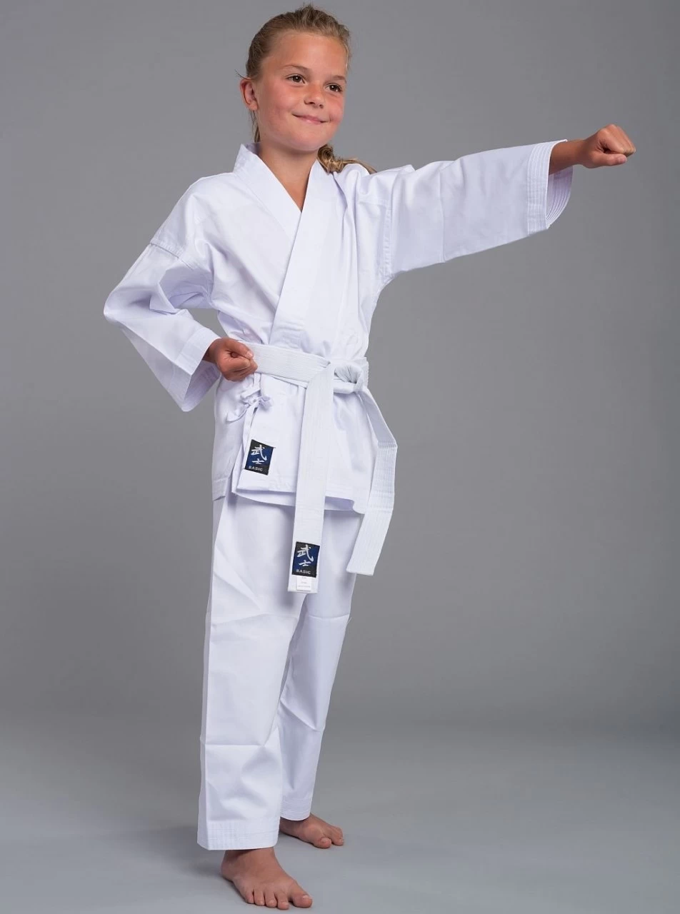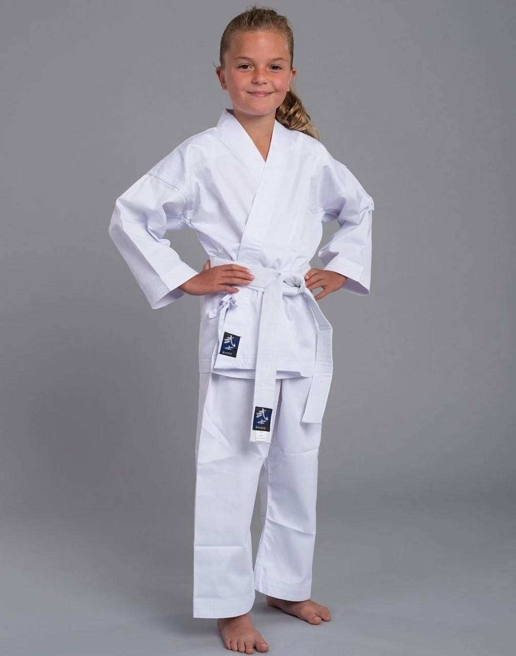 Leichter Einsteigeranzug aus 7,5 oz Mischgewebe (55% Polyester, 45% Baumwolle), reinweiß, traditionelle Jacke, Hose mit Gummibund, weißer Gürtel beiliegend.