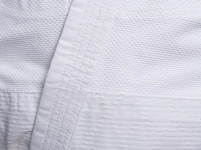 Jackenunterteil mit durchgewebtem Muster, Hose mit Gummibund und Knieverstärkung für alle Größen, weißer Gürtel beiliegend.