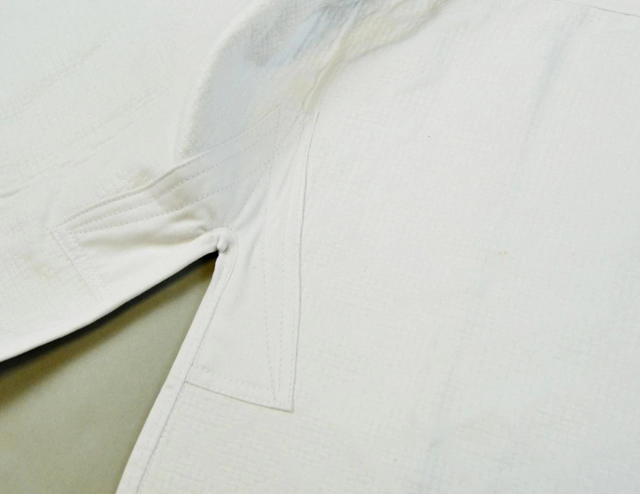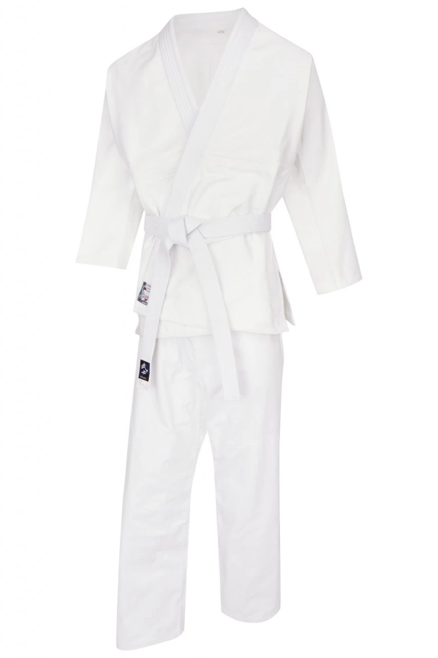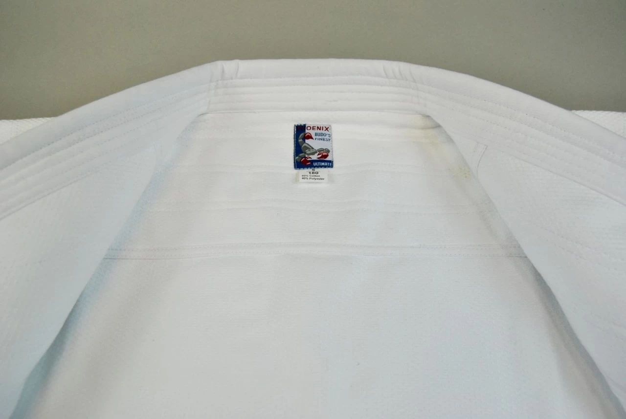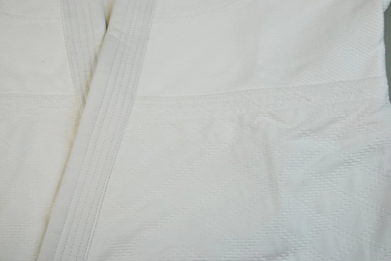 Reinweißer Wettkampf-Judogi aus speziellem, innovativem doppelt gewebtem Mischgewebe-Stoff aus 60% Baumwolle und 40% Polyester (Viscose), d. h. kaum Einlaufen beim Waschen und sehr stabil.