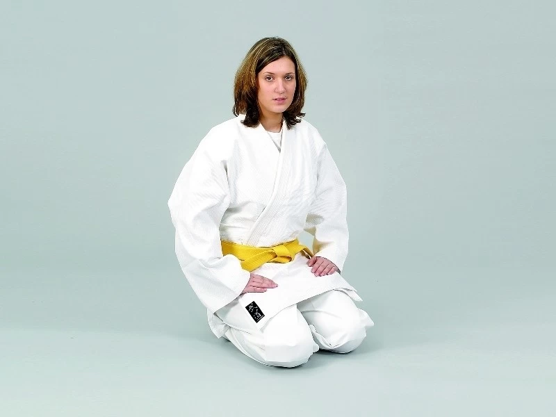 Bestehend aus Jacke mit durchgewebtem Unterteil, Hose mit Gummibund für alle Größen und Knieverstärkung, weißer Gürtel,