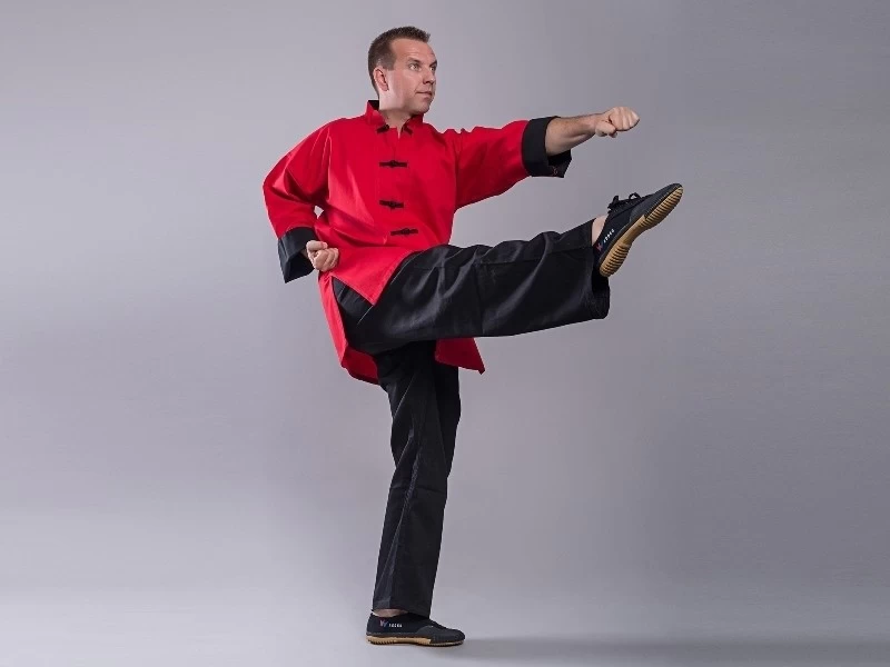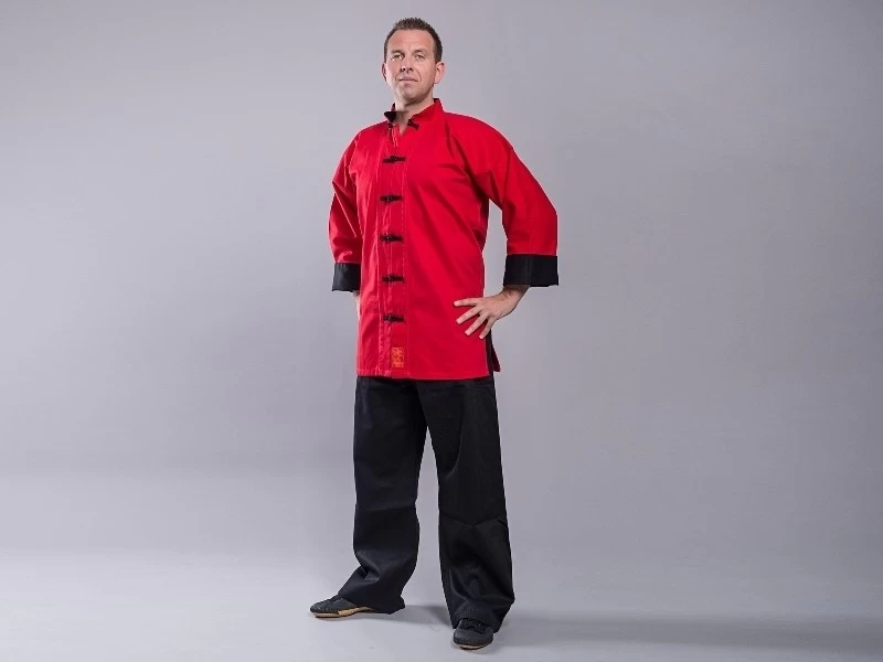 Traditionelle Kung Fu Jacke in rot mit schwarzen Ärmelumschlägen