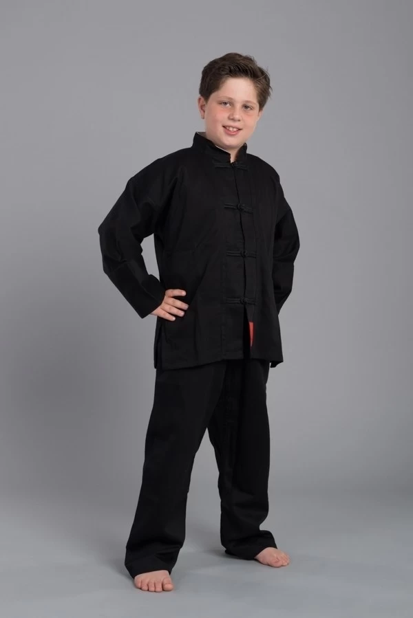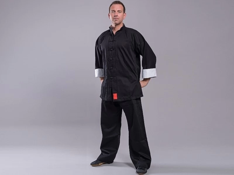 Traditioneller Kung Fu Anzug mit weißen Ärmelumschlägen und weißem Innenkragen